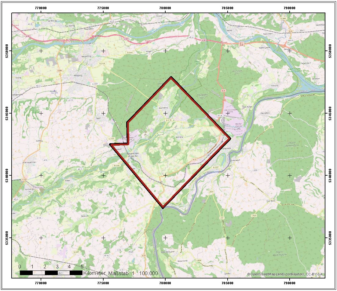 InfraServ Gendorf beantragt in Nähe des Chemieparks eine Aufsuchungserlaubnis von Erdwärme als möglichen regenerativen Baustein zur Wärmegewinnung. Bereits anderweitig vergebenen Nachbarfelder sorgen für die sonderbare Form des beantragten Erlaubnisfelds. (Bild: OpenStreetMap)