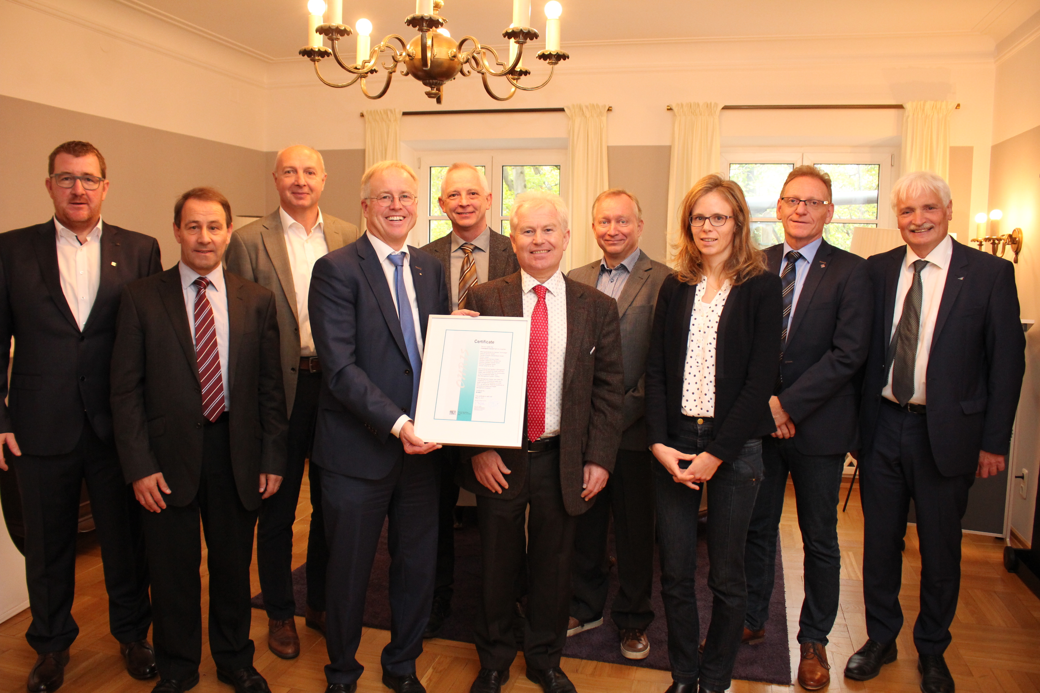 Dr. Bernhard Langhammer (vorne 3.v.l.), Geschäftsleiter des Chemieparkbetreibers InfraServ Gendorf, nahm von Raimund Fußeder (stellvertretender Leiter des Gewebeaufsichtsamts) die neue OHRIS-Urkunde zusammen mit Vertretern der ebenfalls rezertifizierten Unternehmen entgegen.