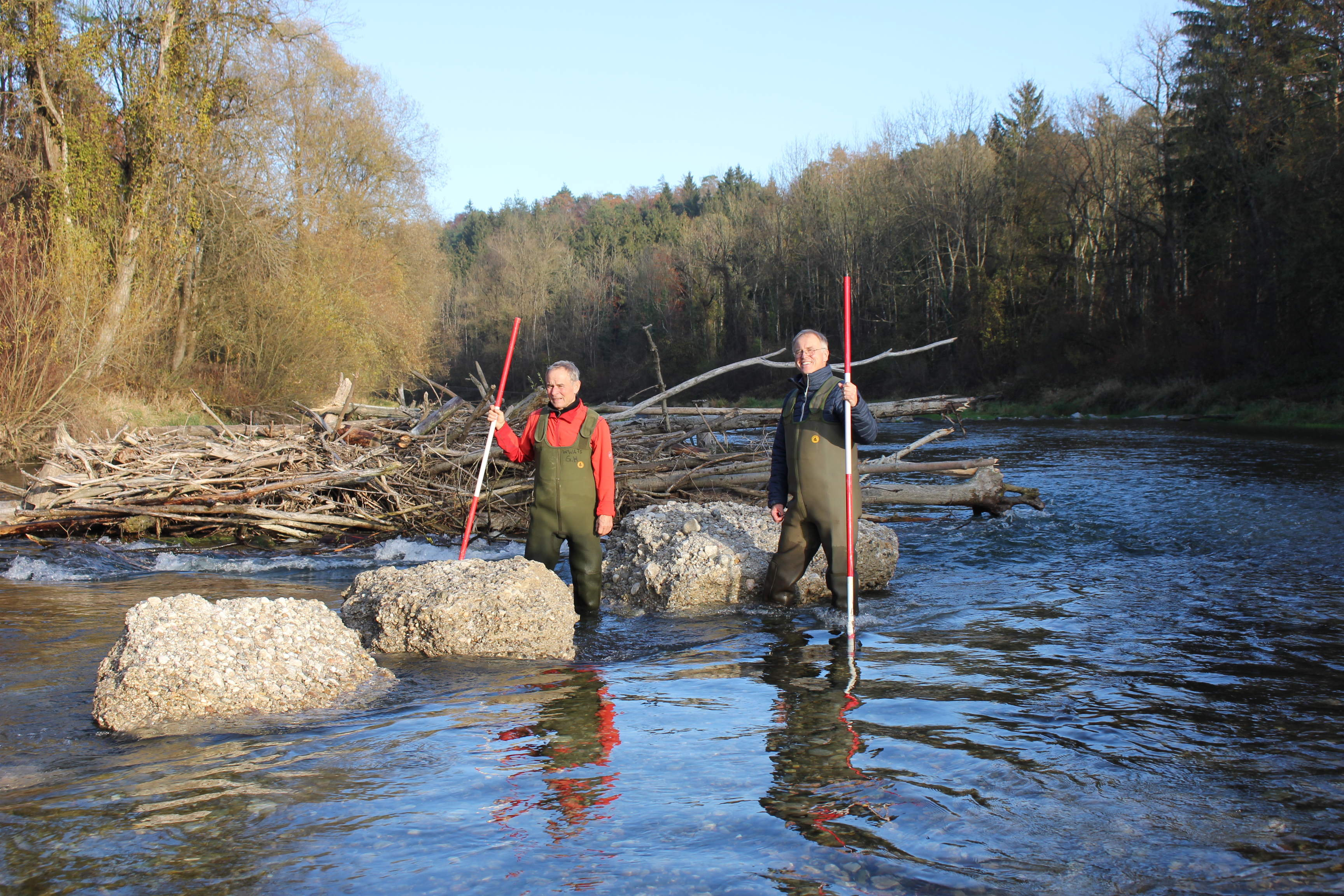 Bessere Bedingungen könnten dabei momentan gar nicht herrschen: Durch die trockene Witterung gehen die Arbeiten, die vergangene Woche gestartet sind, zügig voran. Große Nagelfluh-Felsen sorgen für lebendige Strömungsverhältnisse im Flussbett. Baumwurzeln und anderes eingebrachtes Holz, das mithilfe von Holzpfosten im Flussbett oder am Ufer fixiert wird, bieten gerade für Jungfische überlebenswichtige Unterstände, die sie vor Räubern wie beispielsweise Kormoranen schützen.