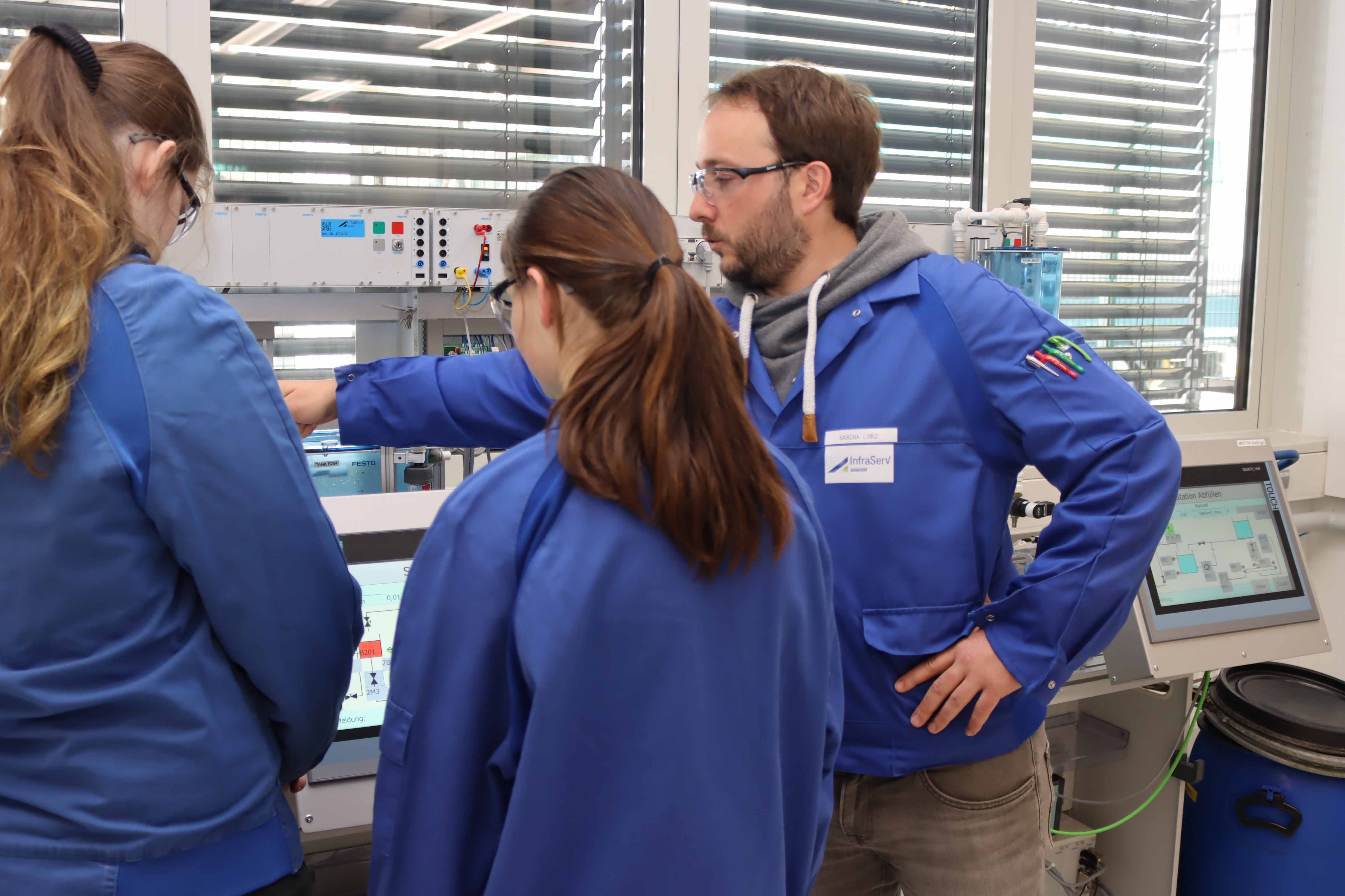 Ganz nah an der Praxis: Ausbilder Sascha Lorz gibt zwei Schülerinnen einen Einblick in den Berufsalltag als Chemikantin.
