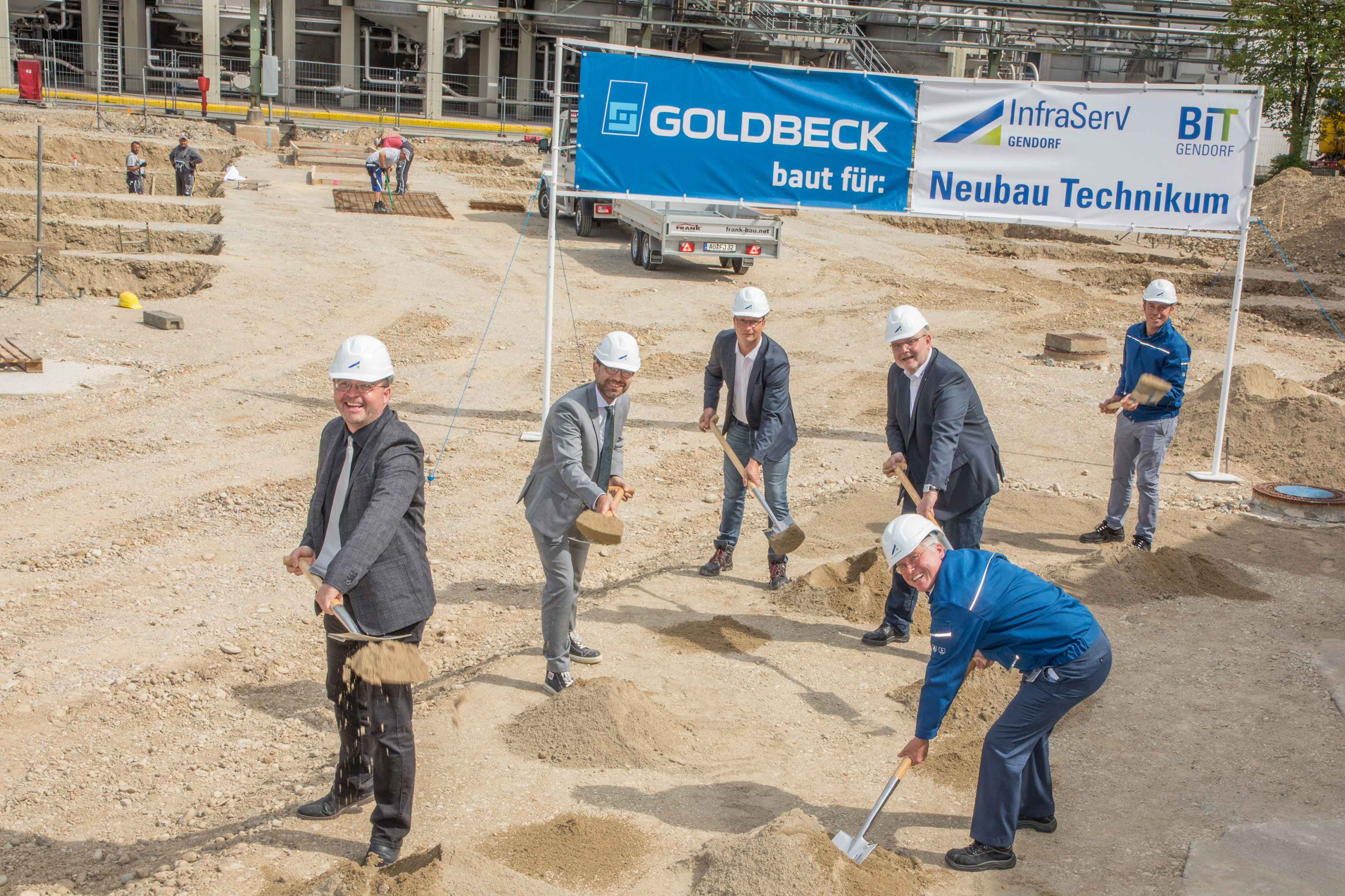 Wie das bereits bestehende Technikum wird auch der Neubau in das Campusgelände der Bildungsakademie eingebettet. Mit einer Raumfläche von 2000 Quadratmetern umfasst er ein Schulungs- und Bürogebäude mit Laboren sowie eine technische Halle. Letztere stellt mit ihrer weitläufigen Aufstellfläche das Herzstück des Komplexes dar: Auf 850 Quadratmetern bilden dort Ausbildungsanlagen einen realen Produktionsbetrieb in kleinerem Maßstab ab. Anstelle von bisher 300 Quadratmetern steht damit eine mehr als doppelt so große Fläche zur Verfügung. Ausgestattet mit modernen Rührbehältern und Festo-Anlagen, die Zusammenhänge zwischen Mechanik, Elektronik und Software vermitteln, werden ideale Voraussetzungen für eine moderne Ausbildung geschaffen. Hierbei werden auch Anlagen aus dem bestehenden Technikum integriert, die dem heutigen Technikstandard entsprechen. „Wir freuen uns, dass wir mit dem Neubau unsere Kapazitäten erweitern und technisch auch in Zukunft auf Höhe der Zeit bleiben können“, so Dr. Bernhard Langhammer, Geschäftsleiter InfraServ Gendorf. Zusammen mit Geschäftsleiter Dominik Gschwendtner (ISG), Jochen Volbracht (Bildungsakademieleiter) sowie den Vertretern von Goldbeck setzte er den symbolischen ersten Spatenstich für die Bauarbeiten.