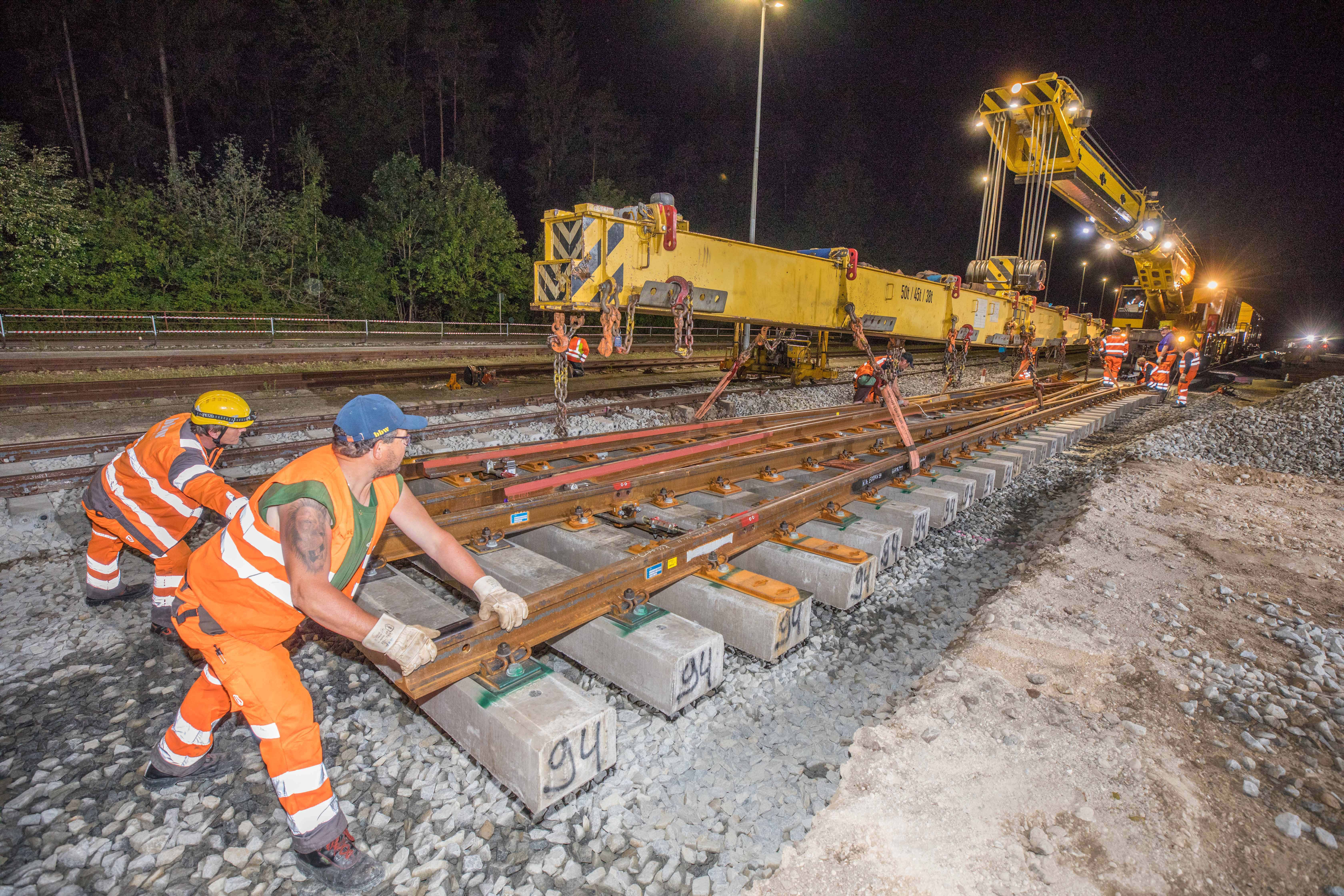 Der jüngste Meilenstein war kürzlich die Verlegung einer Doppelkreuzungsweiche. Mit 32 Metern Länge und einem Gewicht von 250 Tonnen ist die Weiche das größte Einzelteil, das bei den Bauarbeiten verlegt wird. Schon der Name verrät, dass es sich dabei um einen Weichentyp handelt, der an der Kreuzung zwischen zwei Gleisstrecken eingesetzt wird. Zusätzlich zu einer einfachen Kreuzungsweiche erlaubt eine Doppelkreuzungsweiche zudem den Zugwechsel in beide Abzweigungsrichtungen. Weitere zehn einfache Weichen wurden bis Mitte Mai ein- oder umgebaut. „Diese Bauarbeiten sind eng getaktet und wir dürfen keine Fehler machen, denn schon am nächsten Tag fahren wieder Züge auf der Strecke“, beschreibt Helmut Schmid die Verlegung. „Der Einbau muss dabei während des laufenden Betriebs stattfinden, damit im Chemiepark keine Stillstände wegen fehlendem Material eintreten. Aus diesem Grund verlegen wir die Weichen auch nachts, wenn kein Zugverkehr herrscht.“