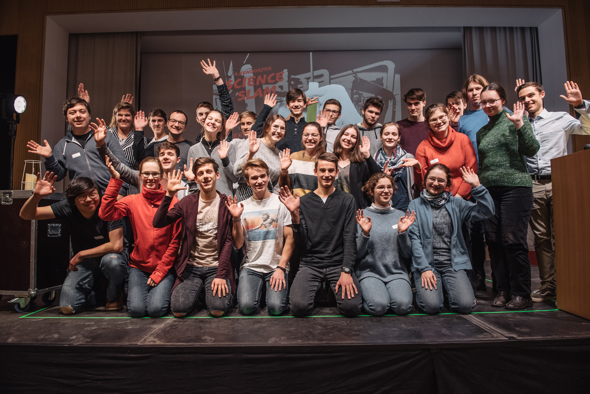 Abschließend besuchten die Teilnehmer den 4. Gendorfer Science Slam, der im Anschluss an den letzten Übungstag am 01.02. im Betriebsrestaurant des Chemieparks stattfand. 2016 war der Science Slam erstmals als Abschlussveranstaltung für die jungen Nachwuchswissenschaftler ins Leben gerufen worden. Glück für die Chemieolympioniken, dass für sie als „Ehrengäste“ die vordersten Reihen reserviert waren: Mit 800 Besuchern war der Saal bis auf den letzten Platz besetzt. So aber konnten die naturwissenschaftsbegeisterten Schüler sich von den Vorträgen der Science Slammer inspirieren lassen, die ihrerseits bereits den Sprung in die Wissenschaft geschafft haben.