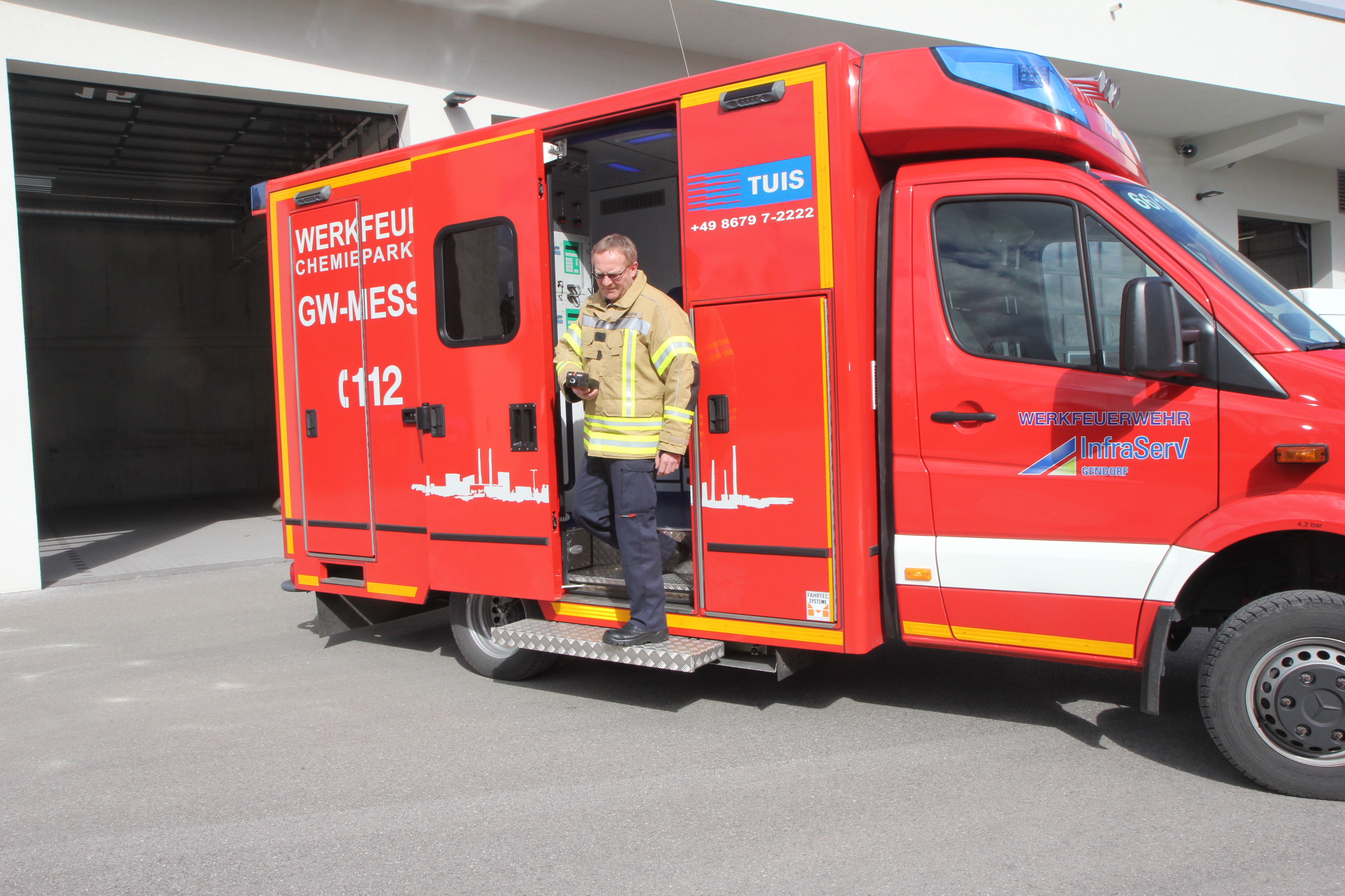 Deser und seine Kollegen können für ihre Messaufgaben auf modernste Technik zurückgreifen: Die Werksicherheit verfügt über einen Gerätewagen mit komplexer Messtechnik, um sowohl im Chemiepark GENDORF als auch außerhalb in der Nachbarschaft oder in der Region Messungen im Rahmen des Notfallmanagements durchführen zu können. Der Messwagen, der äußerlich wie ein normaler Feuerwehrwagen aussieht, ist ein fahrendes Labor. Aus dem Dach ragt eine Sonde, im Inneren gibt es kontinuierlich anzeigende Messgeräte, festinstallierte Sammelmedien für Proben, in den Schubladen sortierte Tests zum Nachweis diverser Stoffe, Funkgeräte, Equipment zur Wasserbeprobung und erweiterte persönliche Schutzausrüstungen wie Atemschutzgeräte. Auf einem pneumatischen Teleskopmast ist eine Meteorologiestation angebracht, mit der Windgeschwindigkeit, -richtung, Temperatur, Luftfeuchte und der Luftdruck am Einsatzort gemessen werden können. „Mit diesen Daten kann zum Beispiel die Ausbreitung einer Schadstoffwolke berechnet werden“, erklärt Herbert Deser.