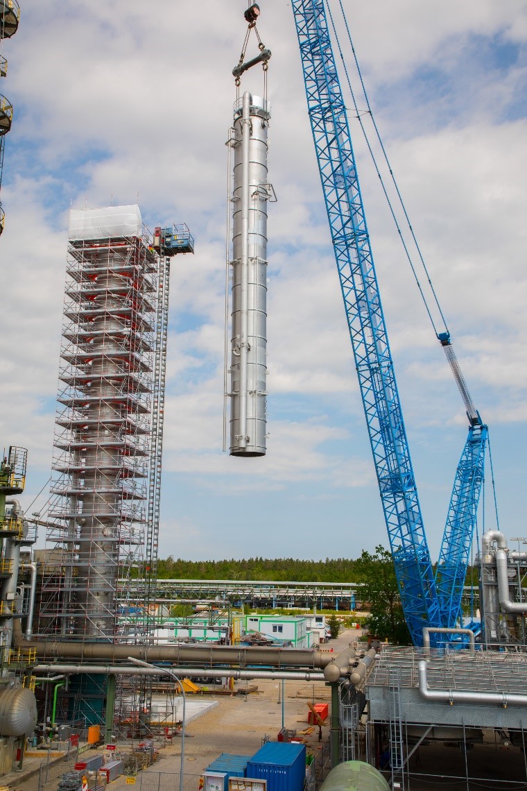 Nach dem Transport von Rotterdam nach Passau gelangte die Kolonne per Schwertransport nach Gendorf. Dort wurde zunächst das Unterteil installiert, bevor schließlich der Hub des Oberteils erfolgen konnte. Nach Abschluss der Arbeiten am vergangenen Sonntag, wird die erweiterte Anlage nun Schritt für Schritt in das Produktionssystem eingebunden. Die gesteigerte Produktion von hochreinem Ethylenoxid (HPEO) wird ab 2020 verfügbar sein.