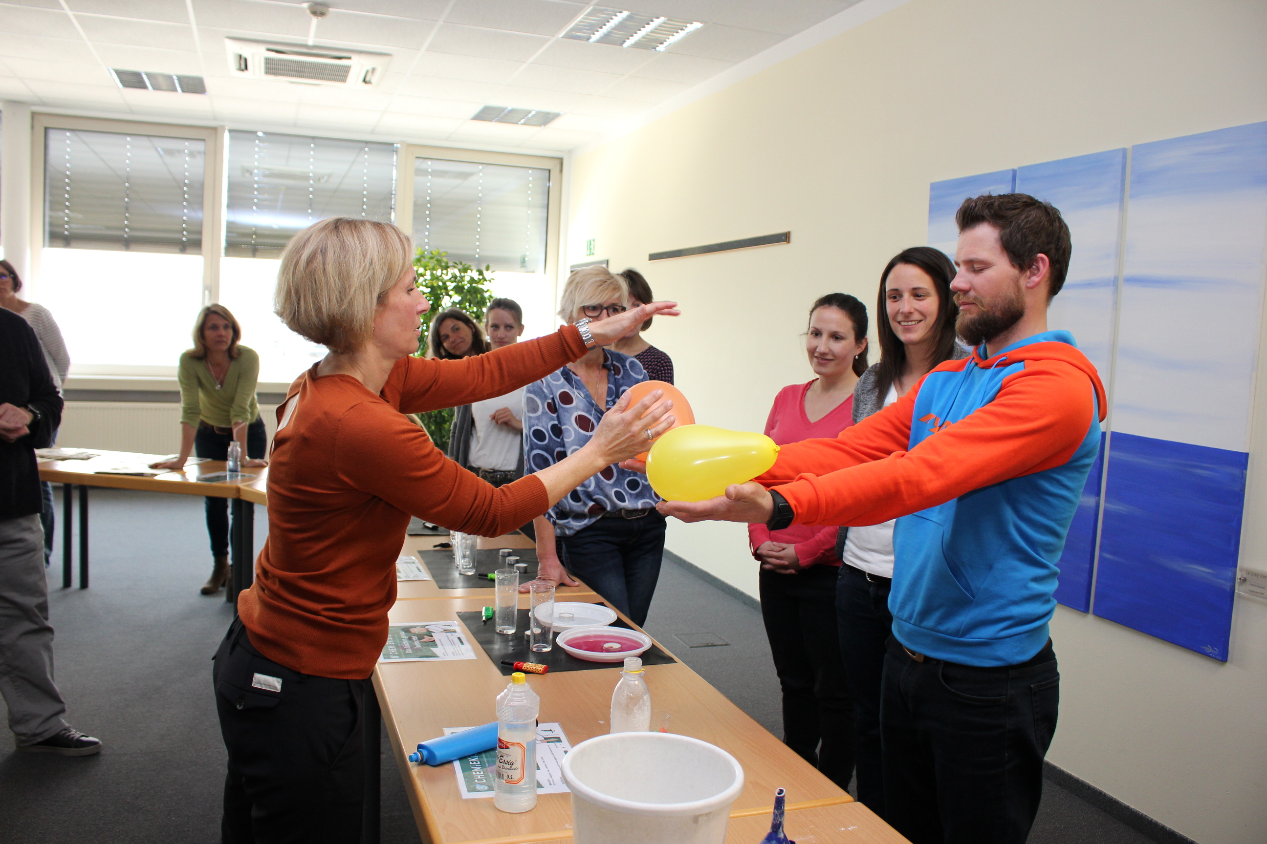 Teelichter, die Glasröhren emporsteigen, die Herstellung von Styroporkugeln sowie Superabsorbern und Eier, die von Flaschen verschluckt werden – welche Experimente sich mit dem Inhalt der „Chemiekiste“ durchführen lassen, das bekamen die Lehrerinnen und Lehrer bei einem Workshop von Carina Hesse vom Unternehmen 3-up gezeigt. Der kostenlose Workshop wird von den Bayerischen Chemieverbänden in Zusammenarbeit mit dem Bildungsförderunternehmen 3-up und Plastics Europe durchgeführt und möchte die Lehrer mit dem nötigen „Rüstzeug“ versehen, um sich selbst im Schulalltag an chemische Experimente mit Schulkindern heranzutrauen. „Mit Hilfe von einfachen und interessanten Experimenten können Kindern chemische Zusammenhänge verständlich gemacht werden“, erläuterte Carina Hesse. Die Referentin Tanja Rühl von Plastics Europe Deutschland e.V. stellte außerdem noch den erprobten Experimentierkoffer namens „Kunos coole Kunststoffkiste“ vor. Auch sie möchte einen Grundstein für das Interesse von Kindern an der Chemie legen. „Es ist wichtig, den Kindern frühzeitig zu zeigen, wie spannend die Chemie sein kann“, so Rühl. Auch die Teilnehmer waren von der Idee der Durchführung einfacher aber effektiver Experimente begeistert. „Die Chemiekiste ist eine wertvolle praktische Ergänzung im Schulalltag, mit dessen Hilfe die Schulkinder aus eigener Erfahrung die Welt der Chemie verstehen lernen“, sagte eine teilnehmende Grundschullehrerin.