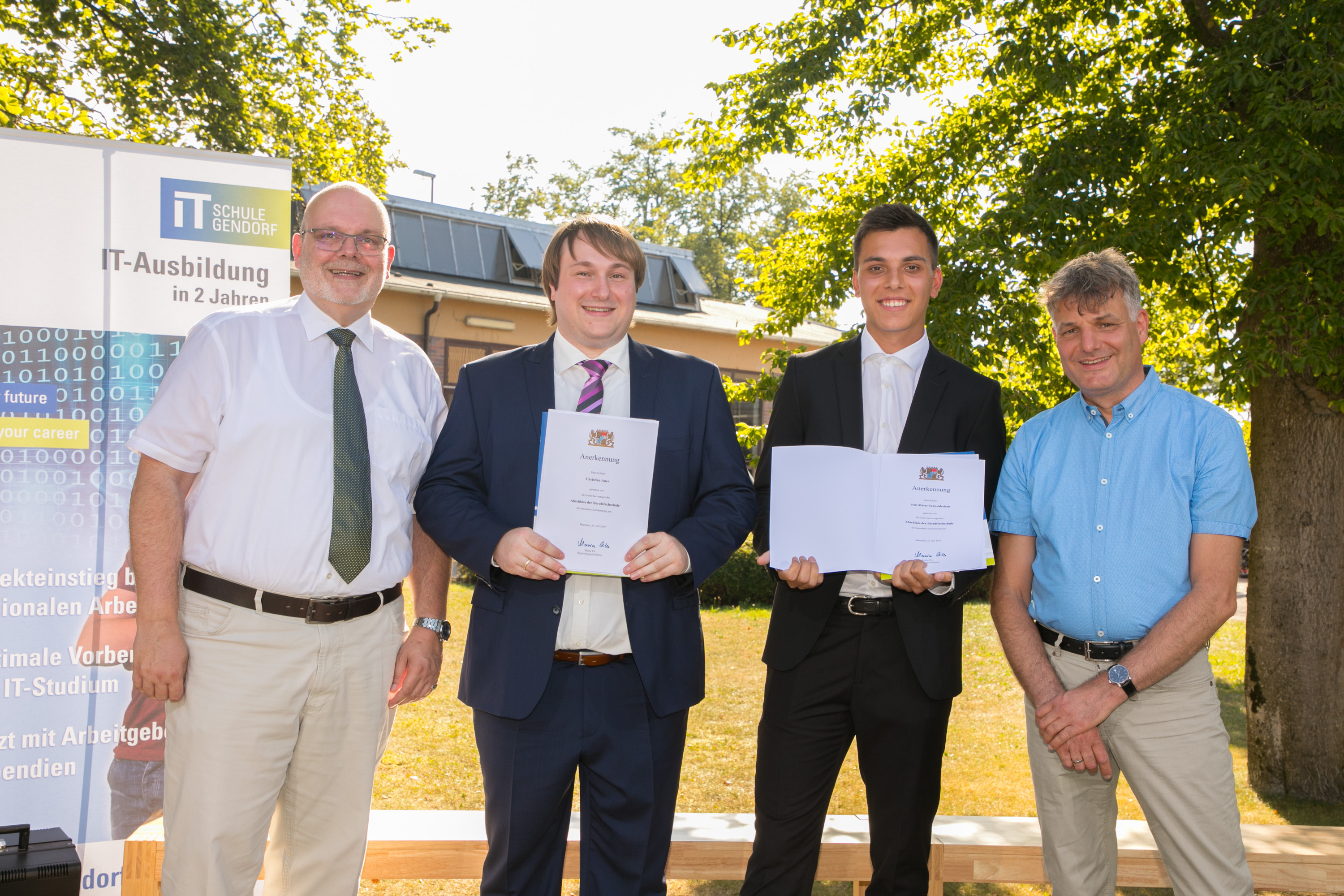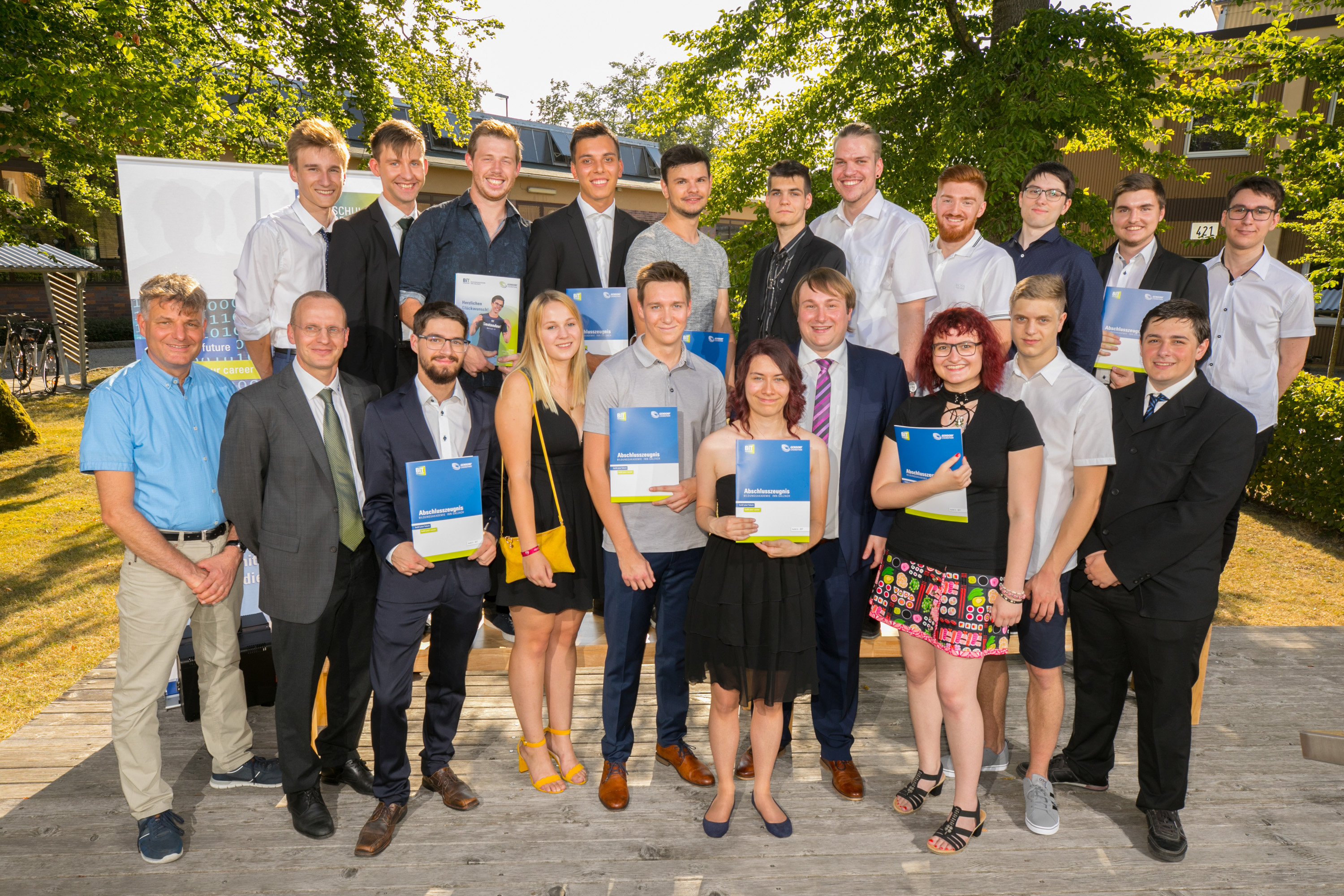 Bilderbuchwetter und strahlende Gesichter: Kein Wunder, denn die 20 Absolventen und Absolventinnen haben sich mit ihrer bestandenen Abschlussprüfung eine exzellente Ausgangsposition für ihre weitere berufliche Zukunft erarbeitet. Das feierten Eltern, Lehrer und Vertreter zahlreicher IT-Firmen gemeinsam mit den Absolventen auf dem Campus der IT-Schule. Die Durchschnittsnote der Absolventen lag in diesem Jahr bei 2,41. Als Jahrgangsbeste mit einer Eins vor dem Komma wurden Jens Maser-Schneiderhahn und Christian Auer mit dem Bayerischen Staatspreis ausgezeichnet. Sie erhielten zudem von Jochen Vollbracht, Leiter der BIT Gendorf, einen Scheck der InfraServ Gendorf überreicht.
