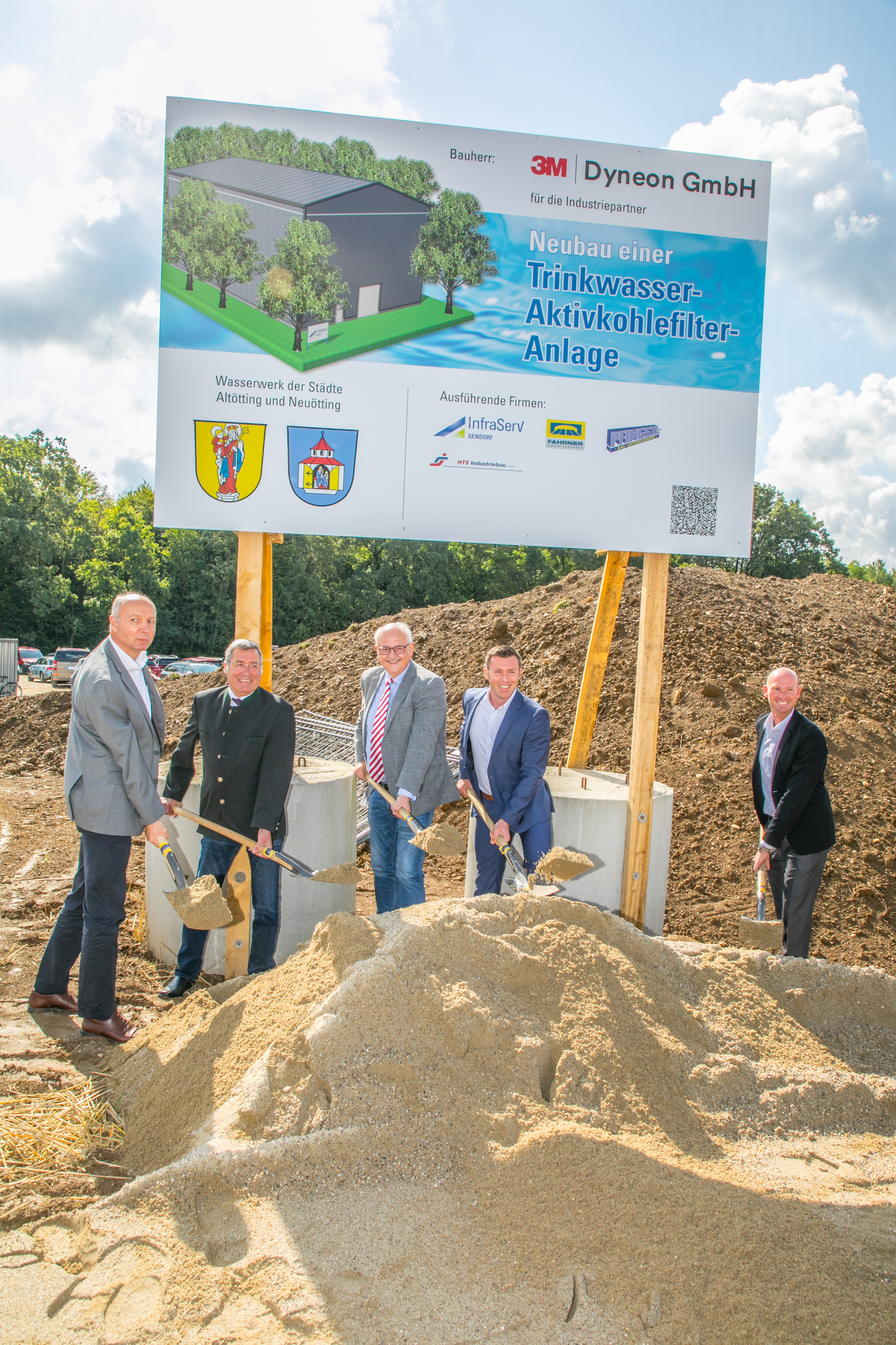 Burkhard Anders, Geschäftsführer Dyneon GmbH, die Bürgermeister der Städte Altötting und Neuötting, Herbert Hofauer und Peter Haugeneder sowie Dominik Gschwendtner, Geschäftsleiter InfraServ, und Florian Bertl, Projektmanager InfraServ, (v.l.n.r.) beim Spatenstich für die zweite Wasseraktivkohleanlage im Öttinger Forst.
