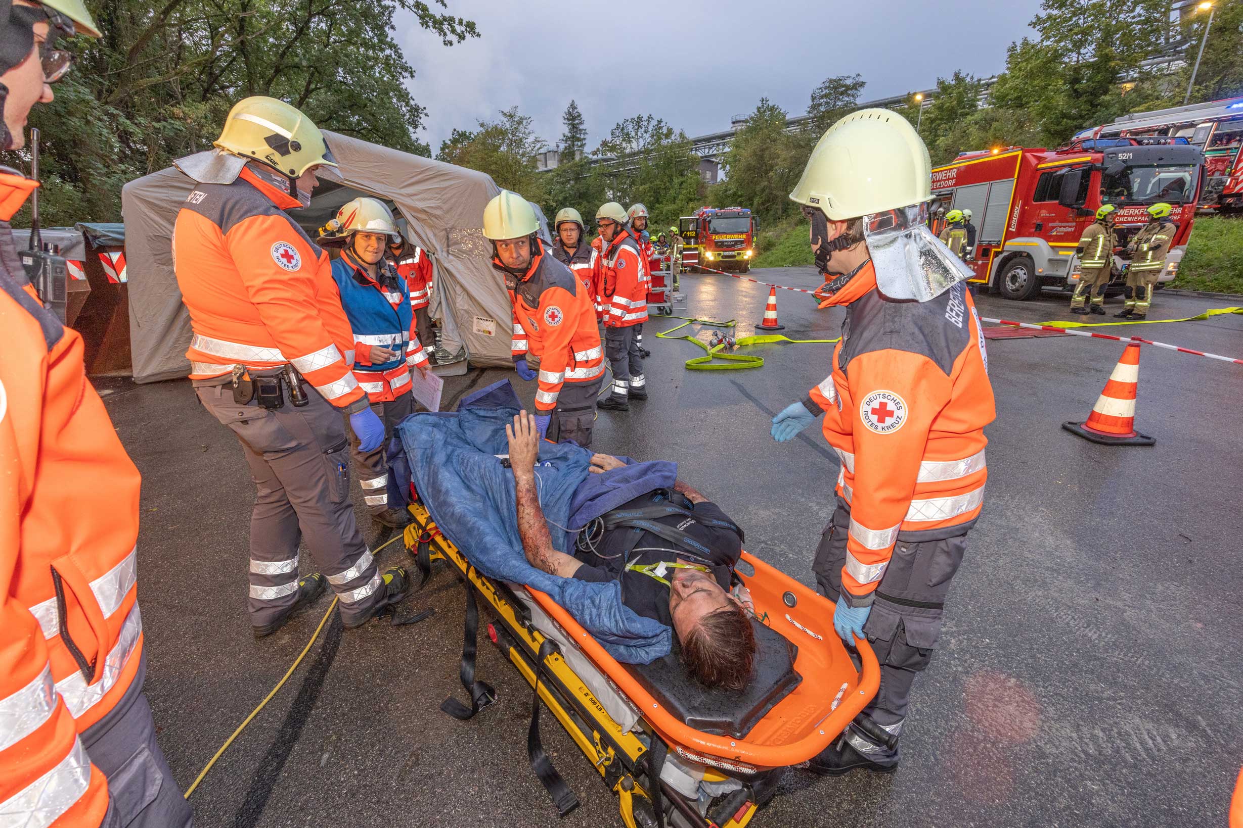 Auf vielfachen Wunsch der externen Einsatzkräfte bot die Werkfeuerwehr bei der diesjährigen Notfallgroßübung chemieparkspezifische Teilstationen an. Dort konnten Szenarien geübt werden, die für die ehrenamtlichen Einsatzkräfte nicht alltäglich sind. Die freiwilligen Feuerwehren konnten beispielsweise das Abdichten von Rohrleitungen und Flanschen mit Arbeitsgeräten der Werkfeuerwehr oder das korrekte Aufschieben eines Schaumteppichs mit Schwer- und Mittelschaumpistolen im Detail durchgehen. Ebenso wurde das Absuchen von Industrieanlagen und die technische Rettung bei einem Verkehrsunfall mit Bahnbeteiligung geübt. Darüber hinaus hatten die Einsatzkräfte die Möglichkeit, auf dem Behandlungsplatz die Versorgung einer großen Anzahl an Patienten komplett und realitätsnah durchzuspielen und so die eigenen Versorgungsstrukturen zu überprüfen.